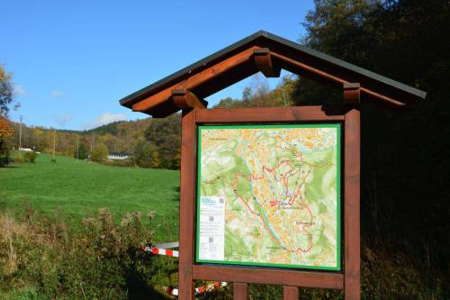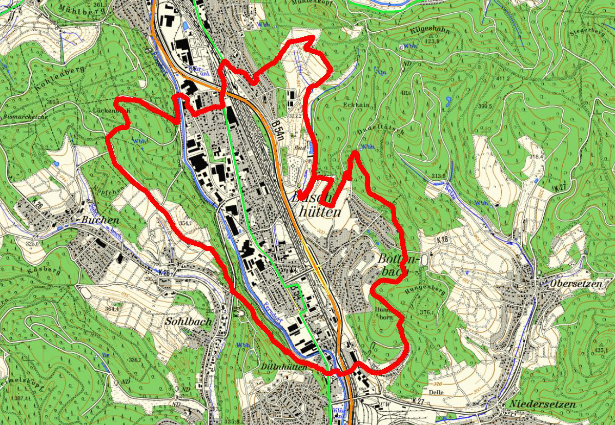 SGV Wanderparkplatz Buschhütten Friedhof - SGV-Hütte Buschhütten - Lehnhofeiche - Käsberg -Bottenbach - Dillnhütten - Walzengießerei Spies - Buschhüttener Eisenhammer - Köhlerplatz - Alter Hohlweg - Freibad Buschhütten - Ausgangspunkt