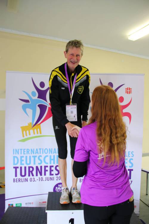 Angespornt von dieser Leistung präsentierten sich auch die Tante Juliane Scheel und der Vater Wolfgang Fuchs in bester Wettkampflaune und errungen in den folgenden Tagen wertvolle Siege für die Männer und Frauen in Schwarz-Gelb. Unabhängig von jeglichen Verwandtschaftsgraden schaffte auch Ulrike Setzer-Britwum den Sprung auf die höchste Stufe des Siegertreppchens in ihrer Altersklasse. Arne Fuchs freute sich sehr mit seinen Turnfestsiegerkollegen und nutzte diverse “Glückwunsch-Orientierte-WhatsAppGruppen”, um seine Gratulation auszusprechen.