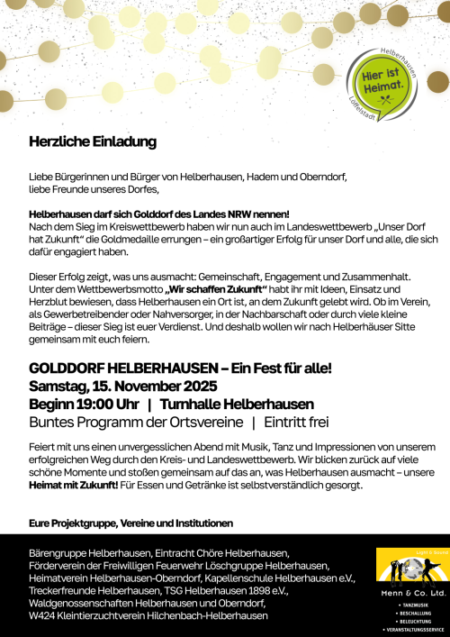 Einladung durch: Projektgruppe, Vereine und Institutionen aus Helberhausen – u.a. Bärengruppe Helberhausen, Eintracht Chöre Helberhausen, Förderverein der Freiwilligen Feuerwehr Löschgruppe Helberhausen, Heimatverein Helberhausen-Oberndorf, Kapellenschule Helberhausen e.V., Treckerfreunde Helberhausen, TSG Helberhausen 1898 e.V., Waldgenossenschaften Helberhausen und Oberndorf, W424 Kleintierzuchtverein Hilchenbach-Helberhausen.