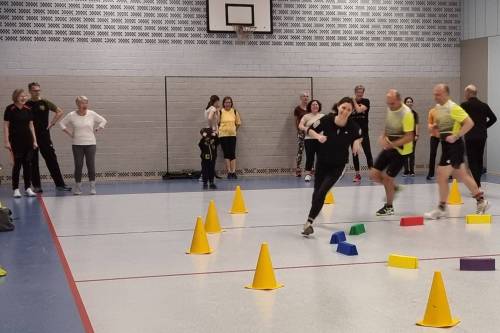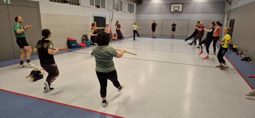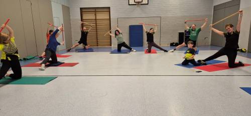 mit dem Stab. Bei intensivem Aufwärmen und Mobilisieren, vielen Schritten bei einem knackigen Fatburner, den Fitnessübungen mit dem Stab und dem abschließenden Durchdehnen waren 20 motivierte Sportler und Sportlerinnen mit Spaß (und Schweiß) dabei.