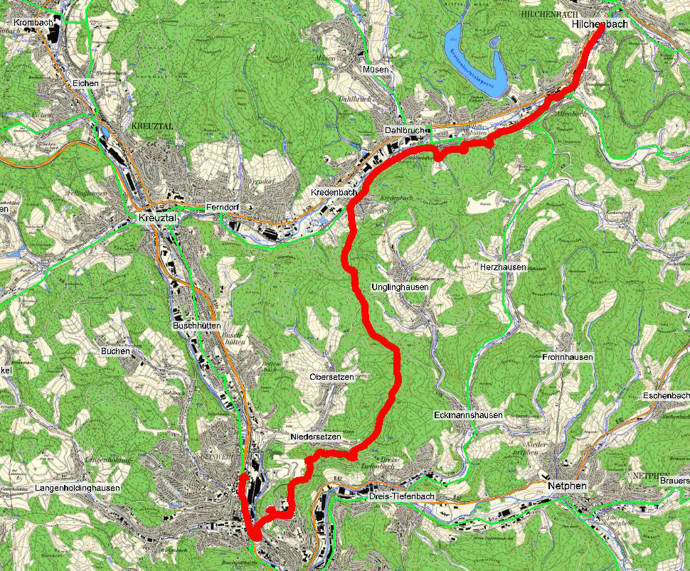 Bahnhof Geisweid – Ferndorfbrücke – Am Schneppenberg – Monte Schlacko – Hölderlinstraße – Campus Universität Siegen – Adolf-Reichwein-Straße – Haardter-Berg-Straße – Dreisbacher Straße – In der Burbach – Bleckerrother Schlag – Dreisbacher Berg – Onkelküser Themenrundweg – Wolfsbornquelle – Siegerbergquelle – Kredenbach – Villa Eisenbau Krämer – Schweisfurth – SGV Hütte Dahlbruch – Bahnhof Allenbach – Haarhausen – SGV Weg – Bahnhof Hilchenbach